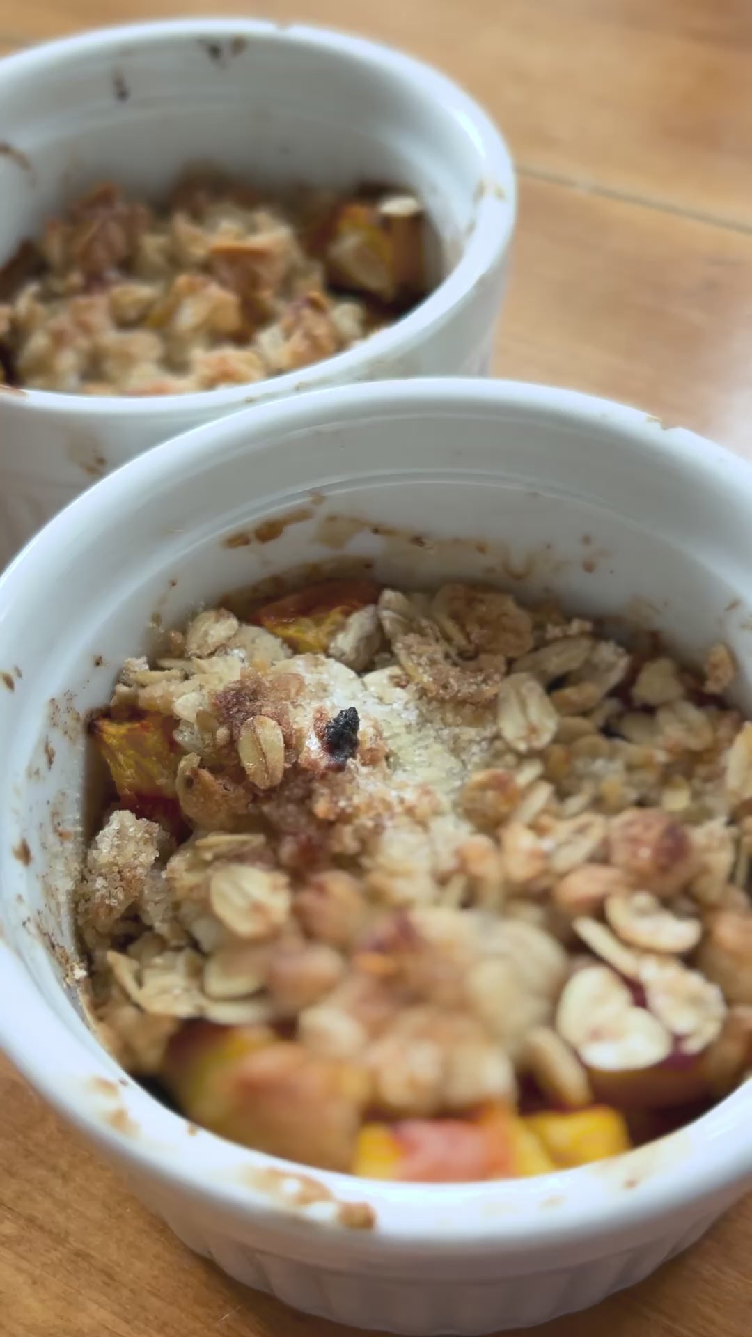 Preheat the oven to 350 F. Butter a small oven safe dish well. Add peach and sona saffron and mix. In a small bowl, crumble remaining ingredients with a fork or your hands so everything this really combined. Sprinkle oat mixture on top of peach and bake for 15 minutes. Serve warm.