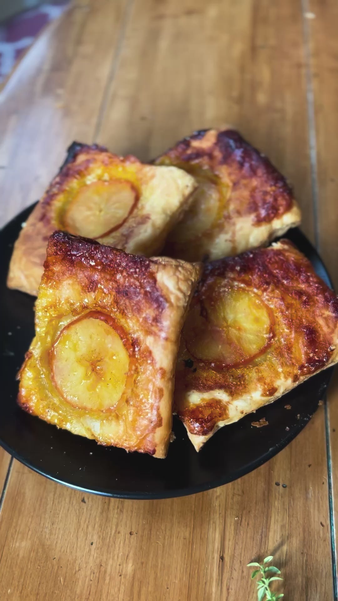 Preheat the oven to 350 F. Line a baking sheet with parchment paper. Sprinkle your work surface with flour. Roll out the puff pastry slightly with a rolling pin. Cut the rectangle into 4 smaller rectangles and keep aside.
