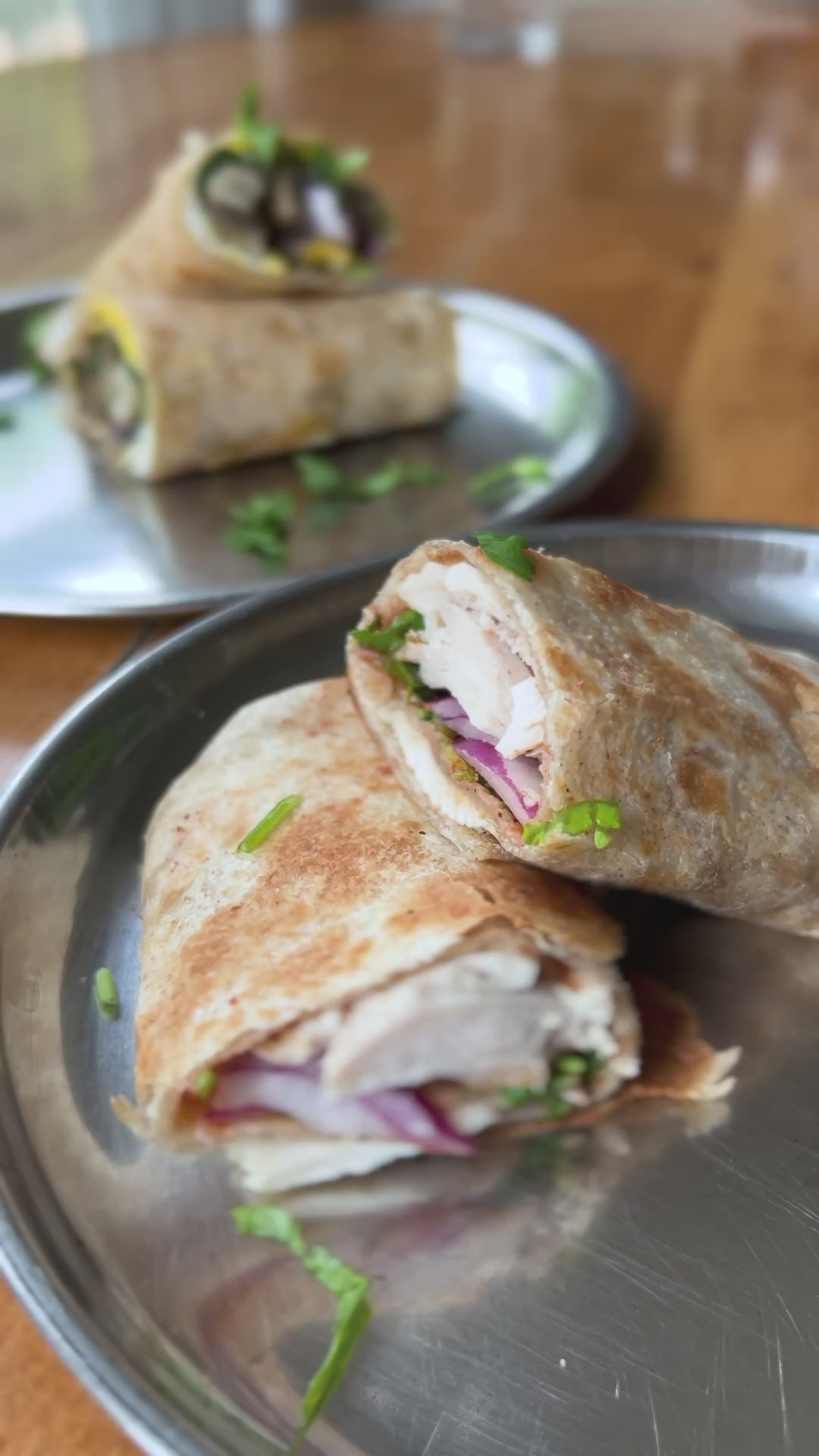 On one roti, add 1/2 of all the ingredients and roll tightly. Repeat the same process with the other roti. Enjoy as a quick snack!