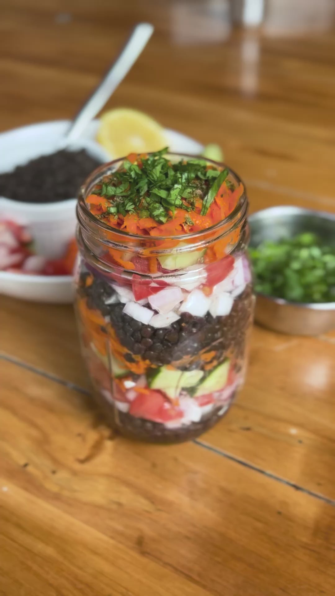 In a mason jar, layer all the ingredients in the following way: add cilantro chutney, olive oil, salt and pepper in the bottom of the jar, then add all the other ingredients.