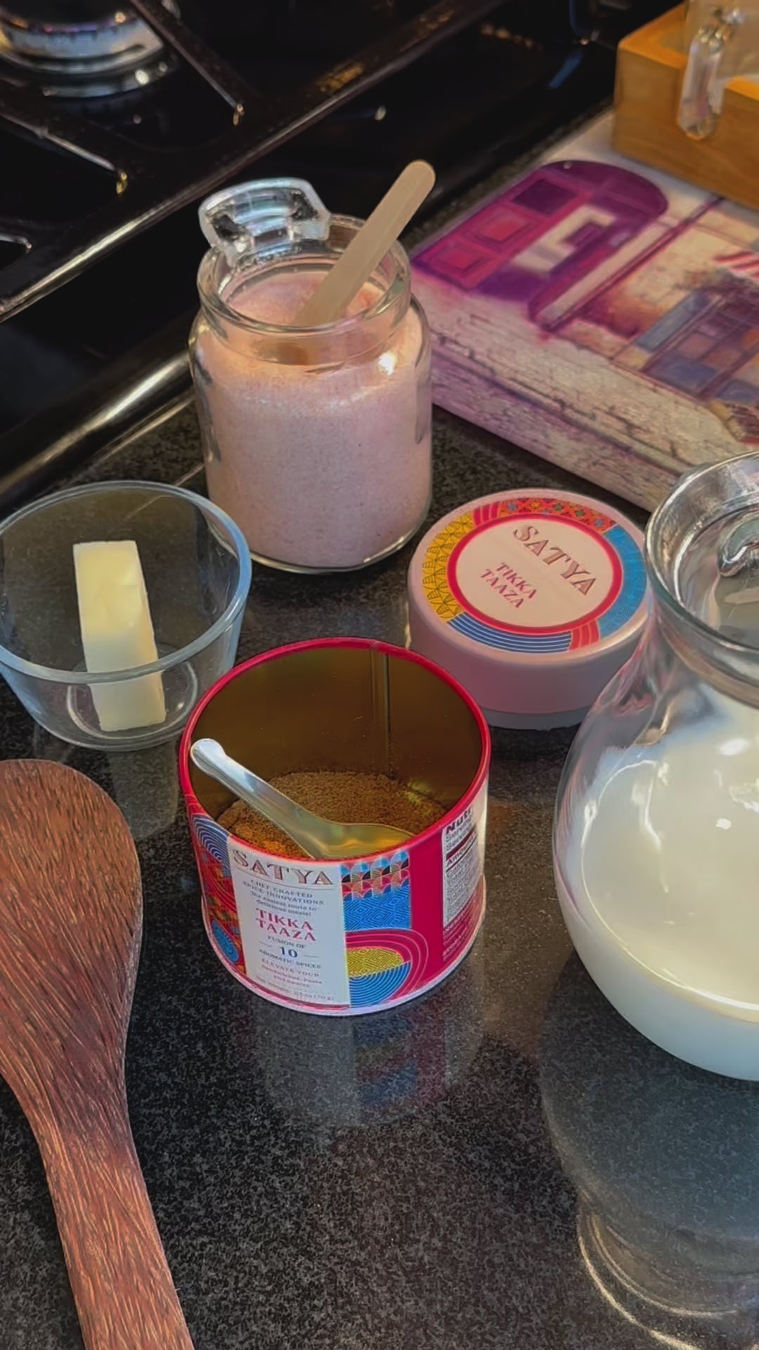 In a medium saucepan, melt butter and flour. Cook roux for 1-2 minutes. Whisk in milk. Add in tikka taaza and season with salt.